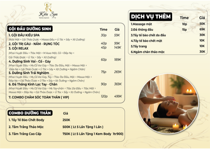 Kiều Spa gội đầu dưỡng sinh tại Thủ Dầu Một, Bình Dương là điểm đến lý tưởng cho những ai muốn tìm lại cảm giác thư thái sau những giờ làm việc căng thẳng. Với không gian ấm cúng, yên tĩnh và dịch vụ chăm sóc chuyên nghiệp, Kiều Spa không chỉ là nơi làm đẹp mà còn là chốn giúp bạn tái tạo năng lượng và cân bằng cơ thể.